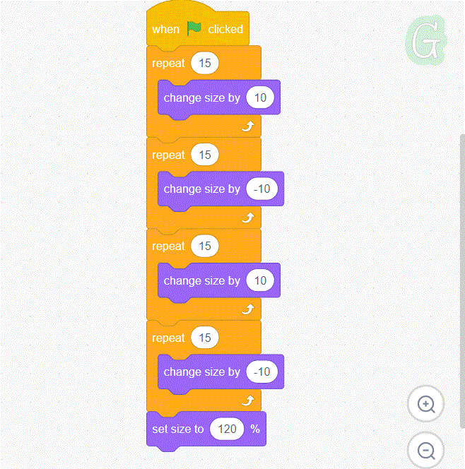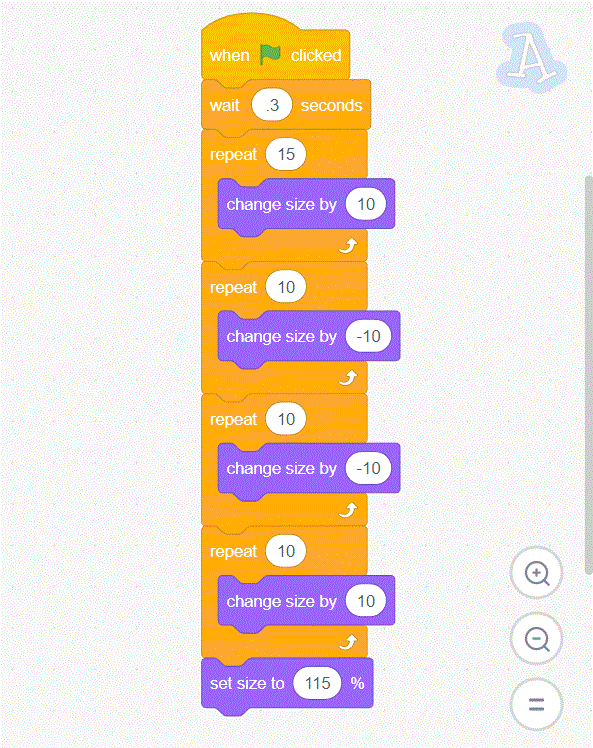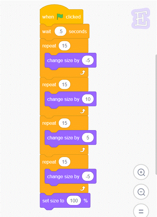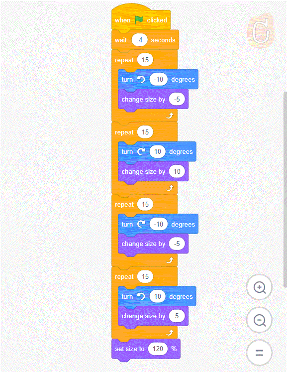 This tutorial is about how to make your name fun and exciting! It's a fun way for students to be creative with their names. I was able to type my name out and have each letter do something cool once you click on the green flag. On each sprite, I would click on a command like, make the letter grow or skrink, or rotate. To make it conintous I would have to repeat the command multiple times as shown below. Most of my turns that go left and right are 10 degrees. Chaging the size of my letter are also by 10 and -10. To make it to one after the other, I had to set each letter a waiting time before they could start their action. At the very end, I want my letters to be at the same size they were at the start, so I set the size to their original size. Click on the button below to see my creation!