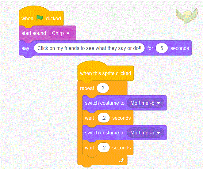 For this tutorial, it explains how to create a cartoon and the many things a cartoon can do. When the green flag is pressed, the parrot will start to chrip and a speech bubble will pop up. The directions will show and the player can click on each character to see what they do! Can you guess what they are trying to do? Click on the button below to find out!