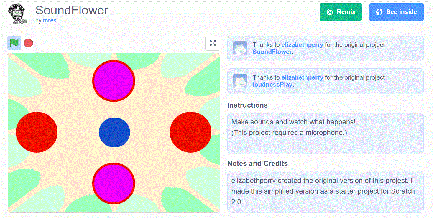 SoundFlower is a cool creation that is based on sound around you. Each time you make a noise, the shapes will grow and widen when the computer picks up a sound. Click on the button below to see it in action!