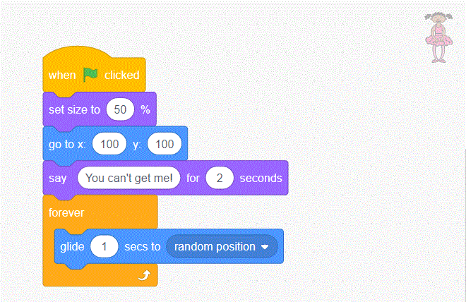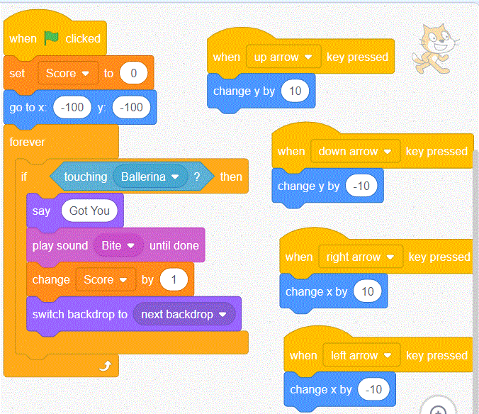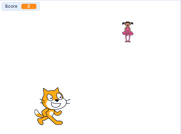 In this tutorial, we were to create a chasing game. The goal is to use the arrows on the players keyboard to chase the ballerina. Each time the play presses down on an arrow, it the cat will move 10 in that direction. Each time the cat reaches the ballerina, the play will get one point. Can you beat my high score of 10? To play, just click on the button below!